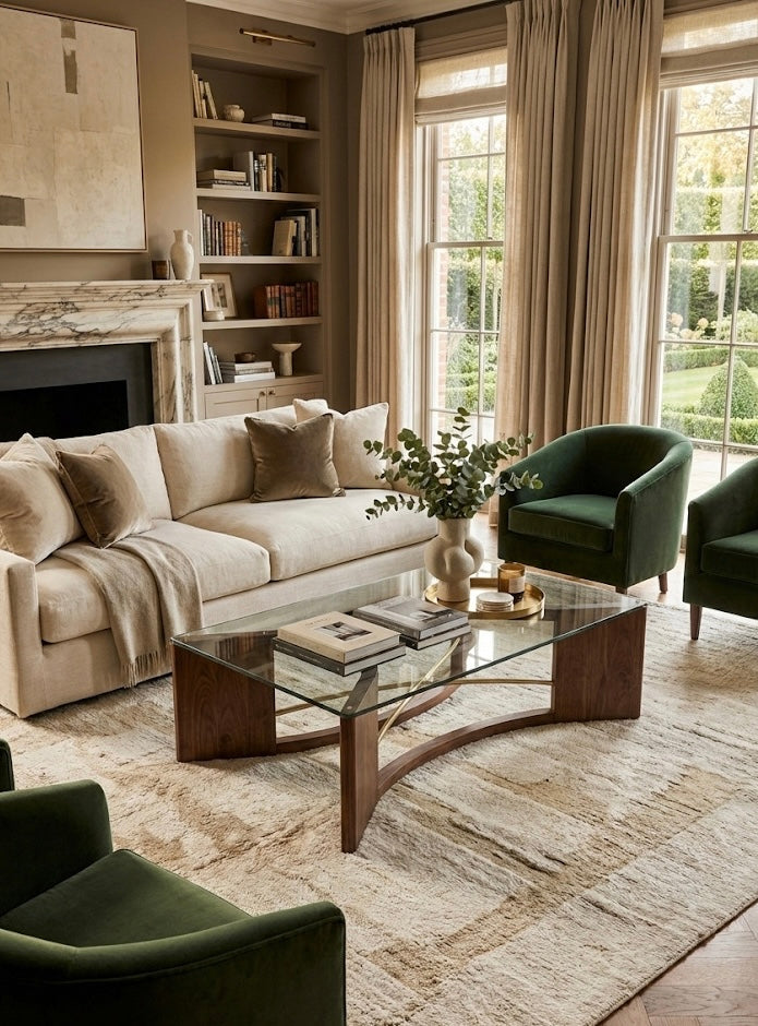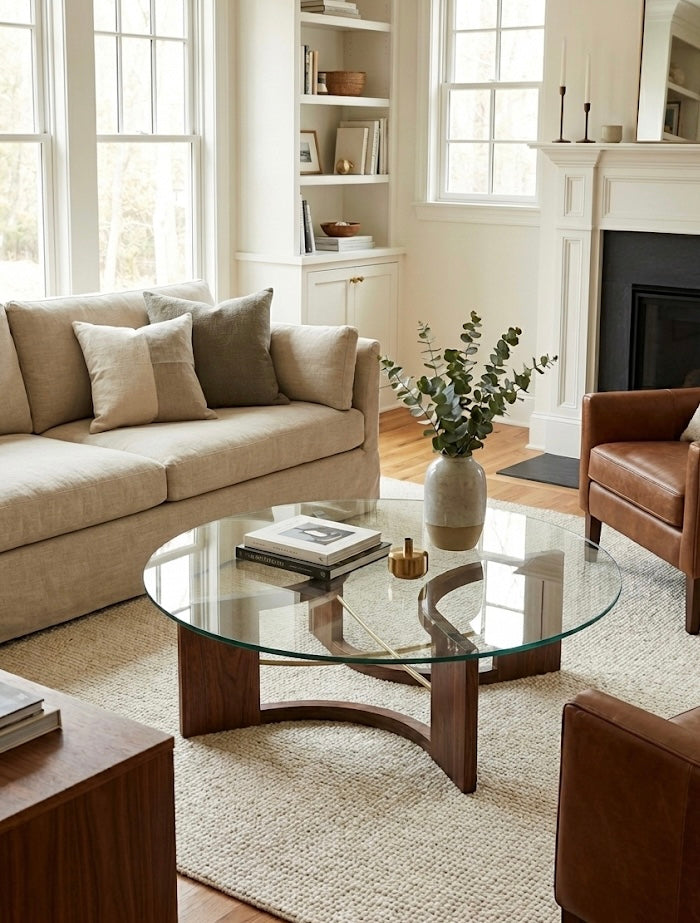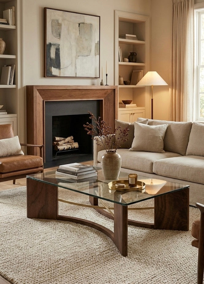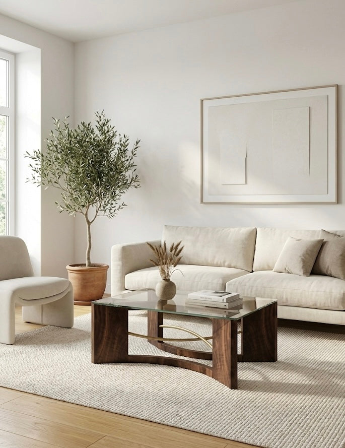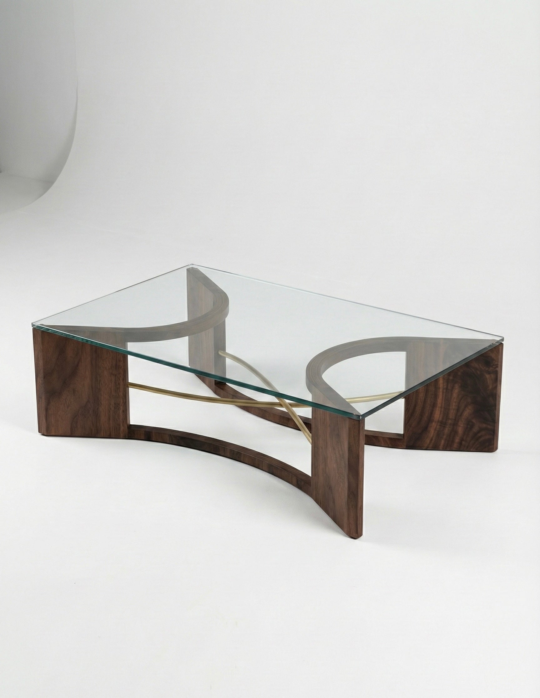 The design is anchored by two hand-sculpted arches of solid Black Walnut, chosen for its deep, resonant grain. In a departure from pure tradition, the wood is pierced by dual brushed brass rods—one straight, one gently curved. This interplay of metal and timber creates a delicate structural balance, holding the heavy 1/2” tempered glass top with an air of weightlessness.