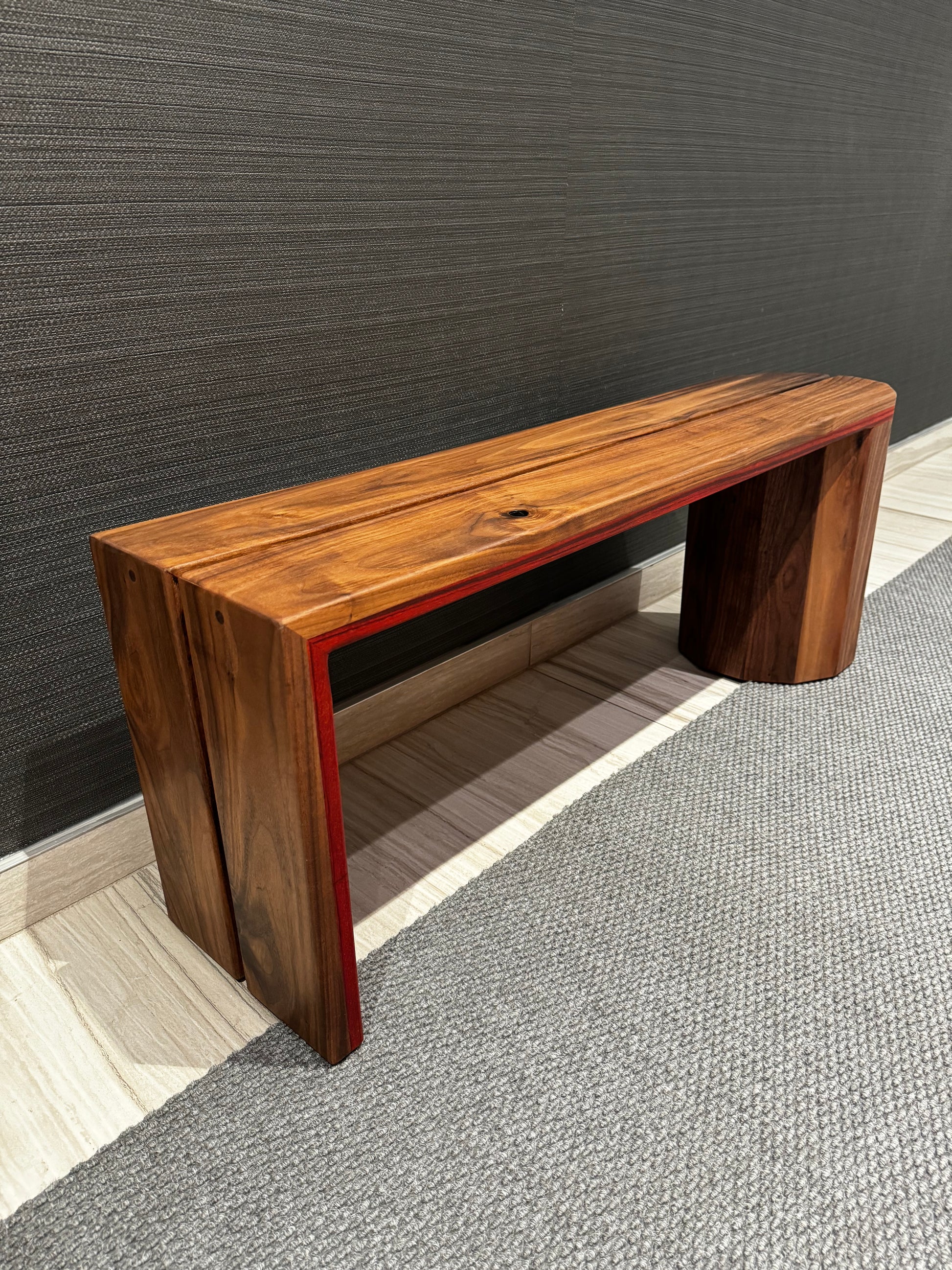 The bench top is subtly split along the center, revealing a hidden core of Padauk red that runs from end to end—emerging through the waterfall leg and hinting at the red underside that quietly powers the entire piece. The top is also shaped to echo the curvature of the column, creating a visual rhythm between structure and surface.