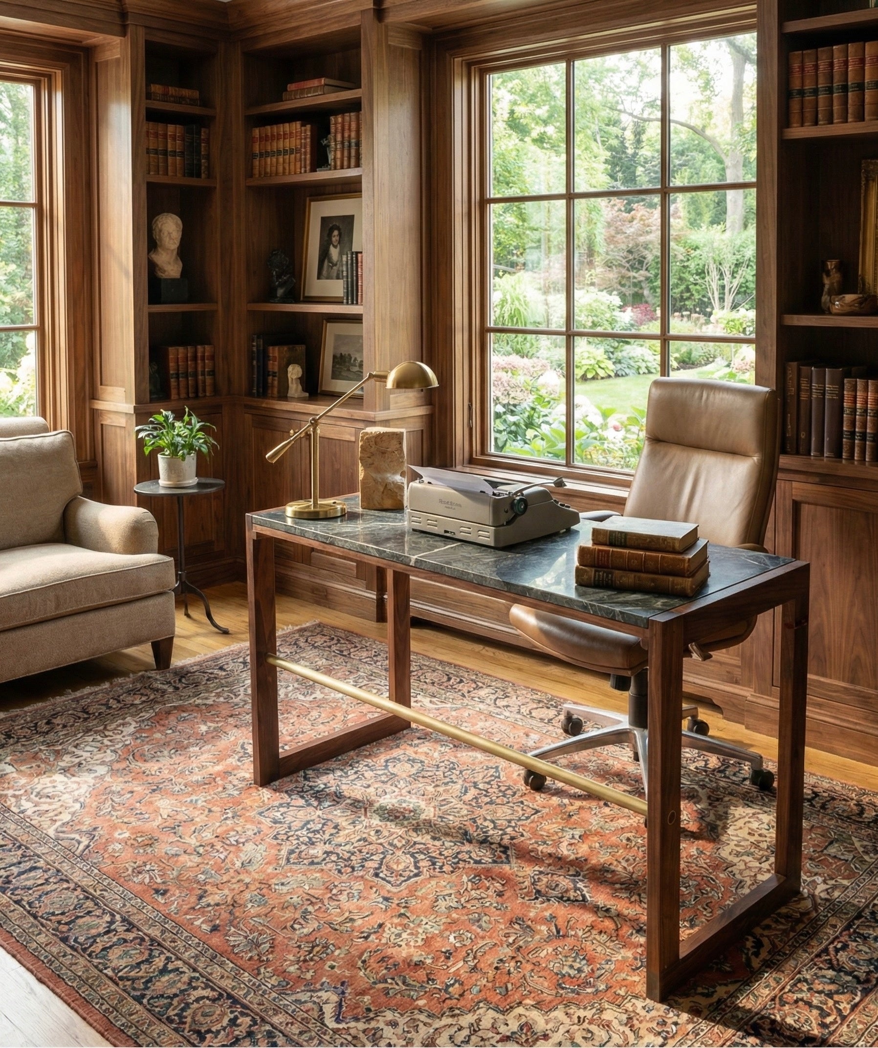 A sculptural writing desk that highlights the dialogue between wood, stone, and metal. The frame is crafted from solid walnut with clean, geometric lines, contrasted by a richly textured natural stone top whose veining introduces organic movement and subtle color shifts. A solid brass stretcher runs the width of the desk, bringing structural integrity and a quiet sense of refinement.