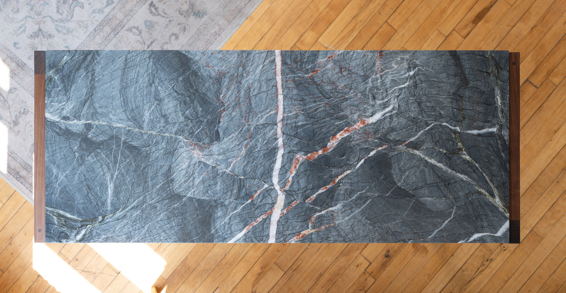 The desk’s materials are left honest — the walnut is finished naturally, the stone is celebrated for its unique markings, and even the small red inlay is cut from naturally red wood rather than paint or stain. This commitment to authenticity is central to my work: every piece is built by hand, from solid materials, with details that emerge from the character of the materials themselves rather than being imposed on them.