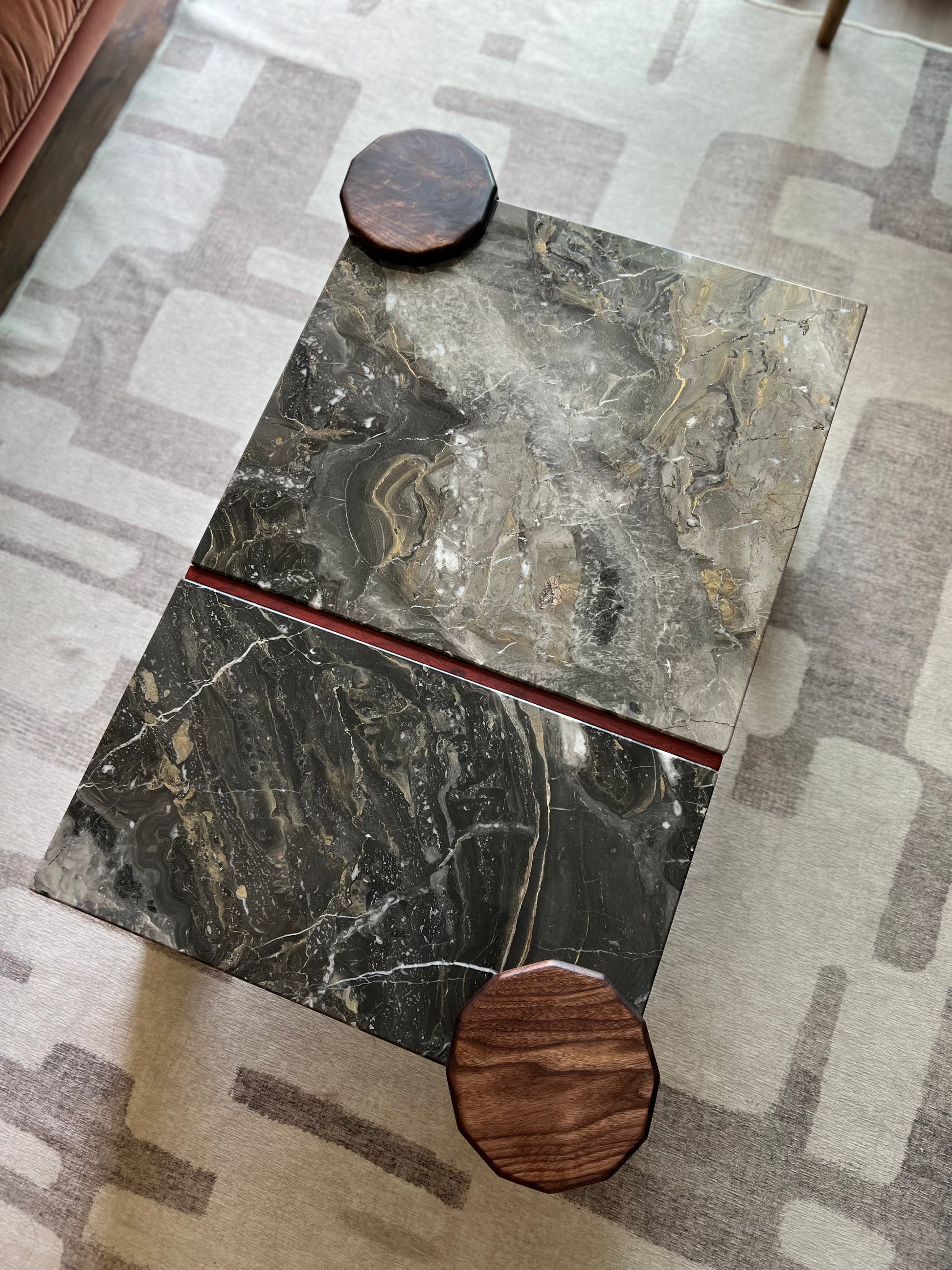 This handcrafted coffee table embodies modern elegance and natural beauty. The table features a stunning stone slab, split into two distinct sections with a vibrant redline of Padauk wood running between them. The stone’s rich, intricate veining offers a unique visual texture that balances earthy tones and dynamic patterns. Complementing the stone are two built-in oversized coasters made from solid walnut, seamlessly integrated into the design and attached magnetically to the table’s corners. The walnut coasters add warmth and functionality, blending beautifully with the sleek stone surface.