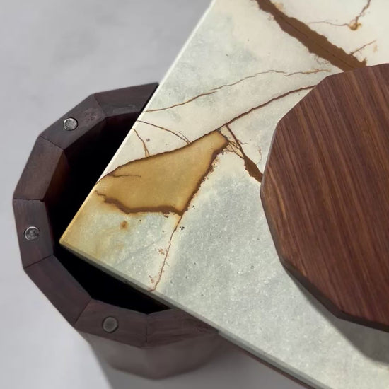 Each piece is meticulously crafted, highlighting the harmony between nature and design. The solid walnut legs, with their angular and cylindrical shapes, provide a sturdy foundation while showcasing the natural grain of the wood. The careful interplay between these contrasting materials—stone, wood, and Padauk—creates a unique piece that invites both functionality and artistry into your home. This coffee table is more than just furniture; it’s a conversation piece, designed to bring nature into modern living spaces.