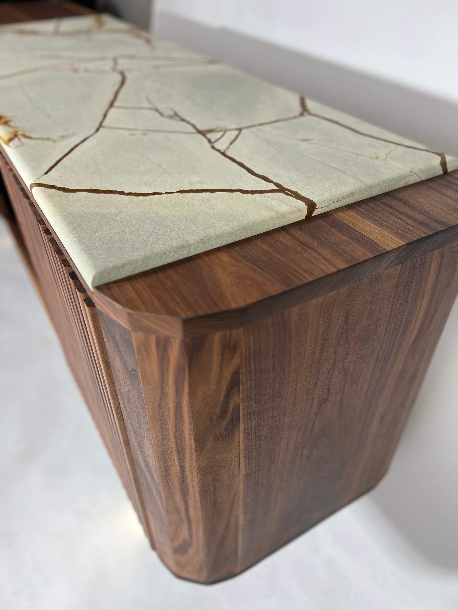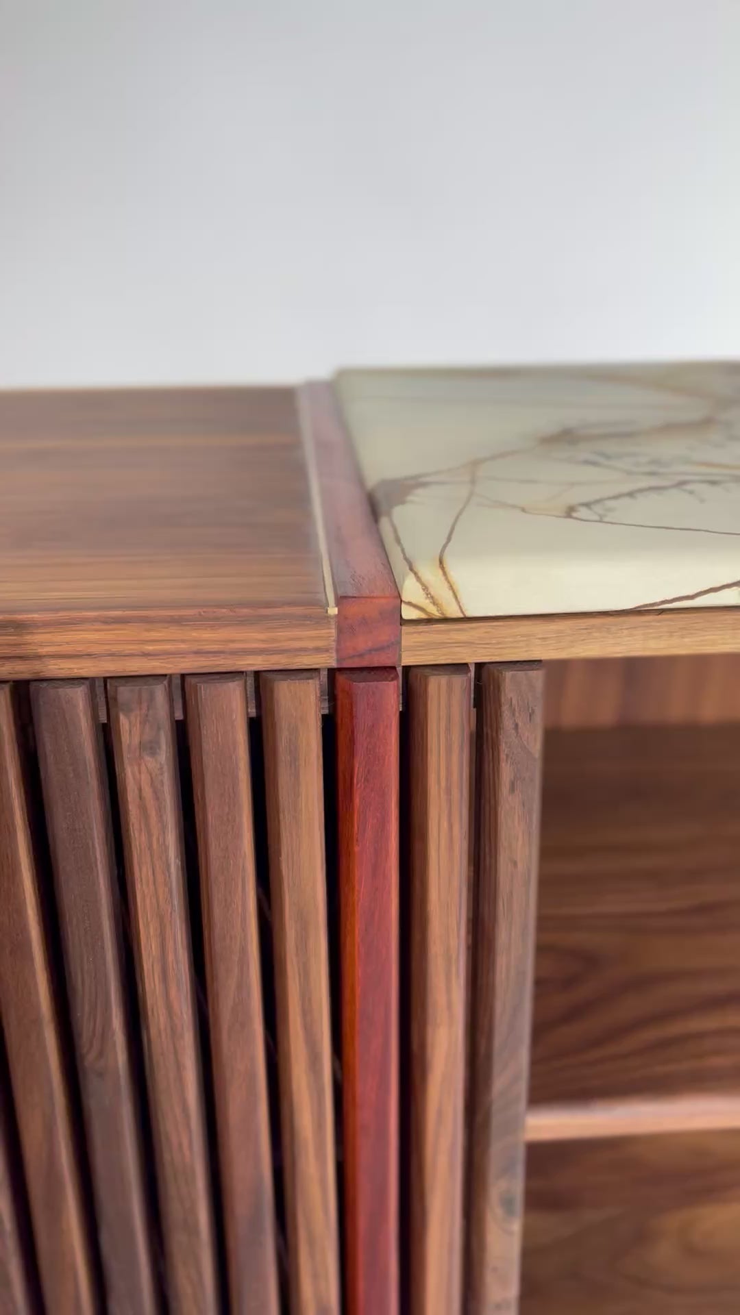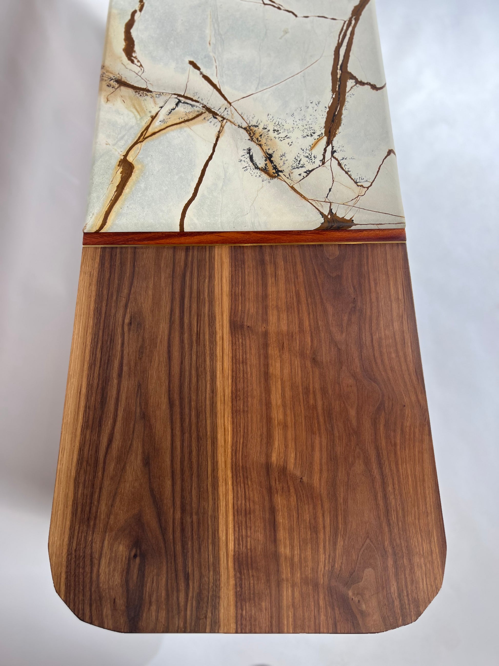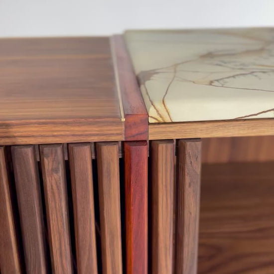 The iSN-v1 is a limited edition piece born from my time in Copenhagen, Denmark. Inspired by the breathtaking beauty of Blue Roma Quartzite, this work of nature, formed over millions of years, serves as the centerpiece of the design. My goal was to honor the captivating stone while ensuring the walnut base's elegant grain remained a harmonious partner, not overshadowed by the quartzite top. This piece embodies the ethos of Redline Designs Collective, a brand founded on a passion for furniture that celebrates and elevates natural beauty. Each creation adheres to core principles: Only solid wood and natural materials are used. Wood is never painted or stained, preserving its organic essence. Every piece is finished with natural oils to enhance and protect its inherent beauty. The signature single redline, crafted from naturally red wood, symbolizes my commitment to these values and serves as a defining hallmark of my work. The iSN-v1 is not just furniture—it’s a timeless expression of design and craftsmanship that will represent Redline Design for years to come.