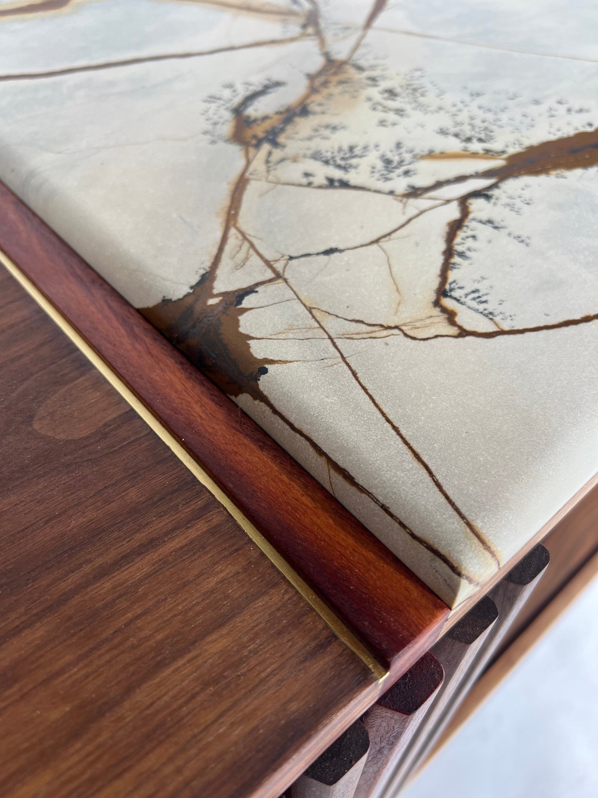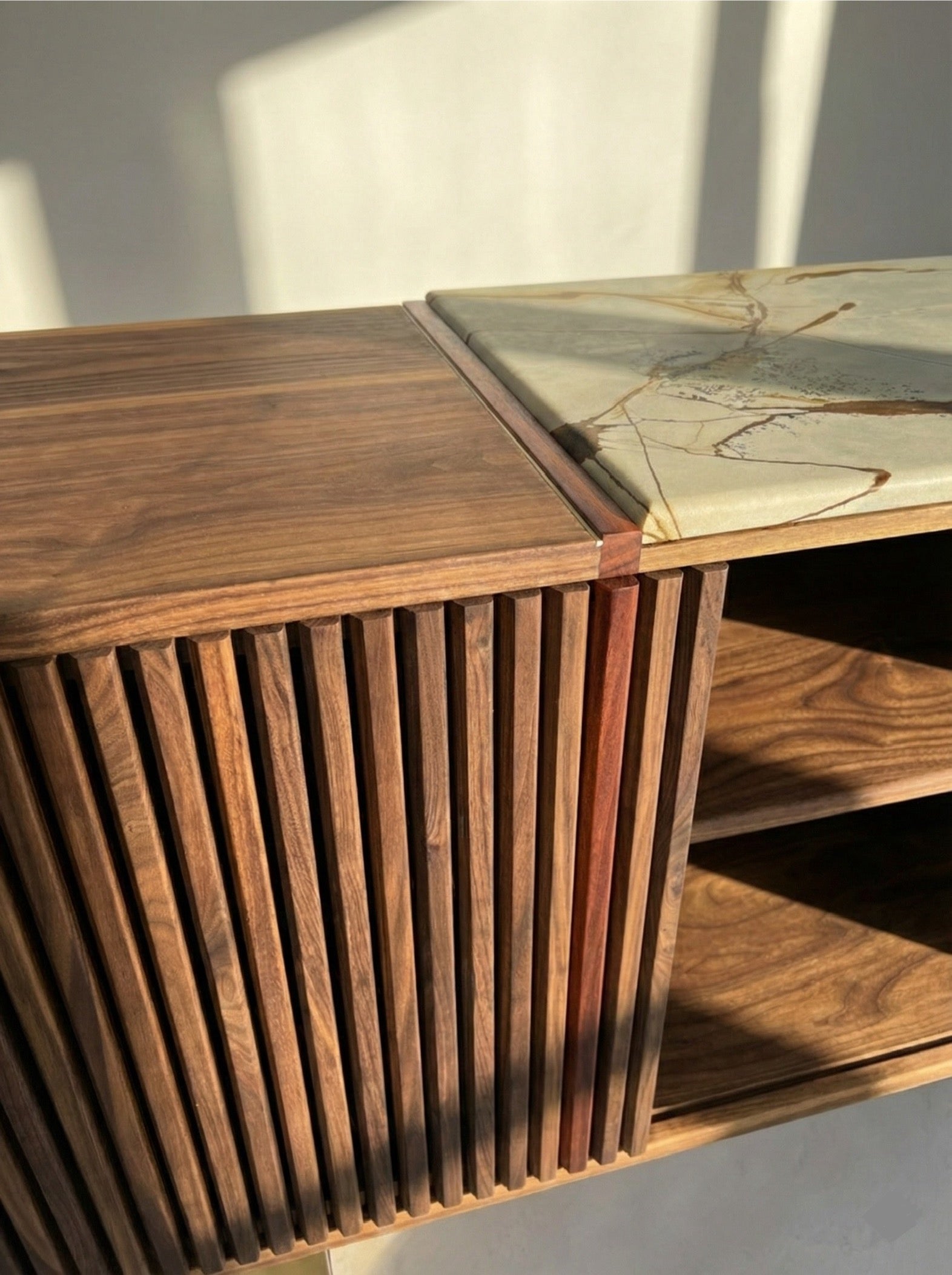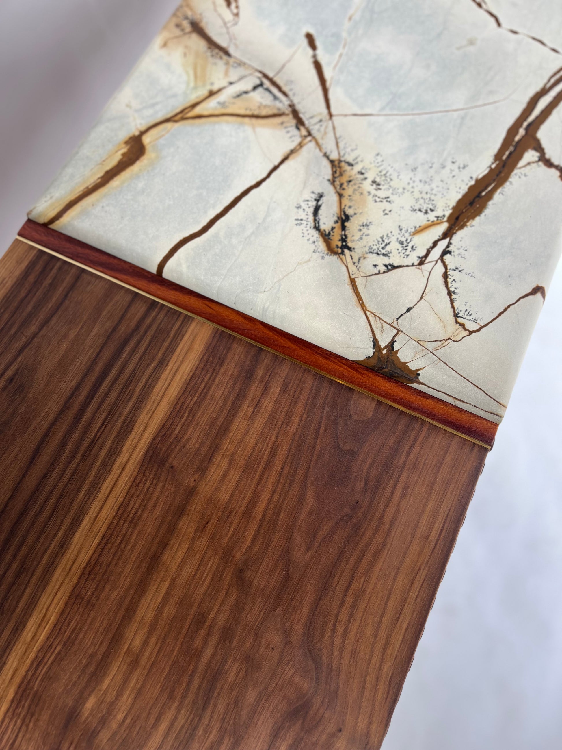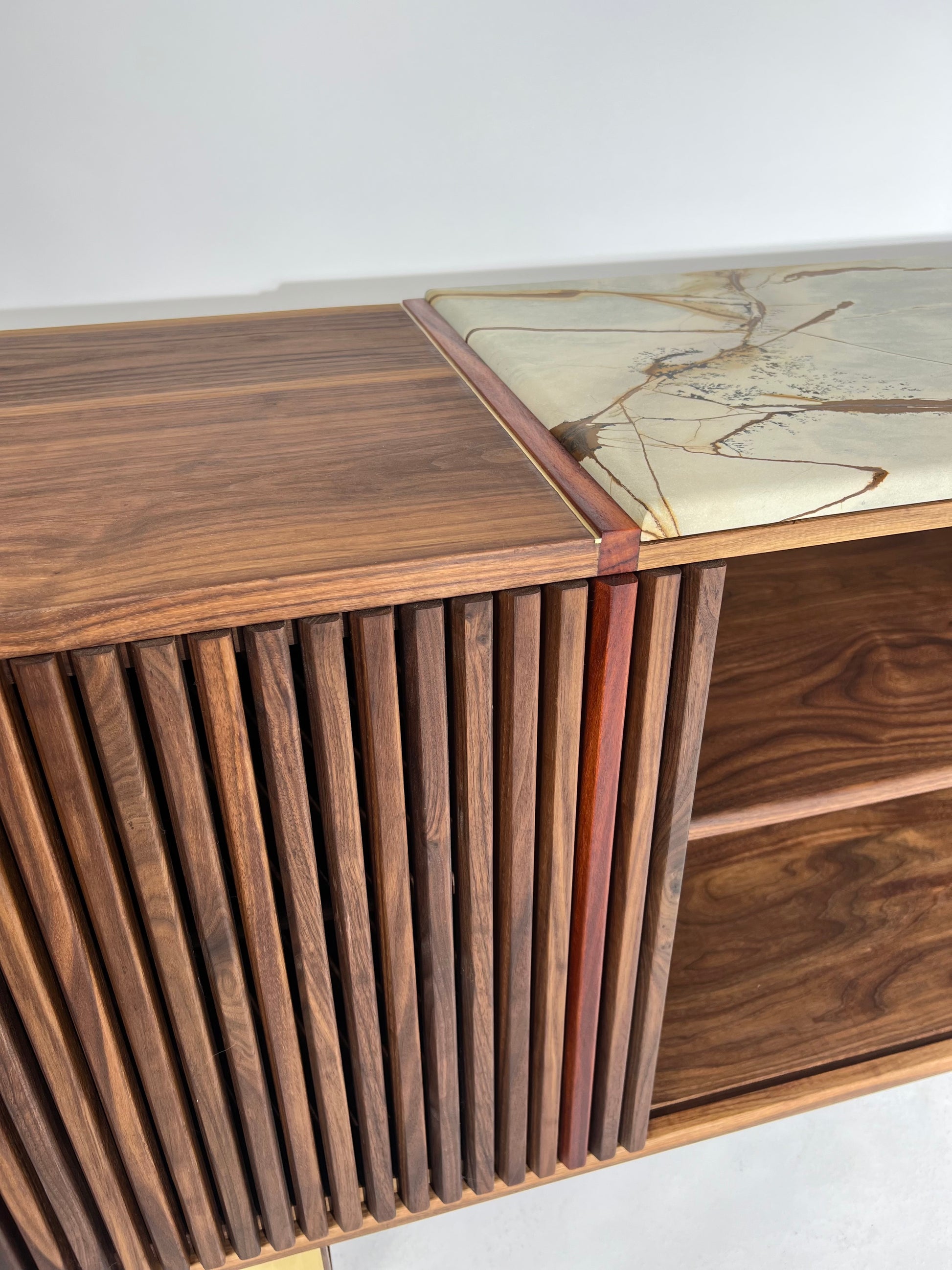 The iSN-v1 is a limited edition piece born from my time in Copenhagen, Denmark. Inspired by the breathtaking beauty of Blue Roma Quartzite, this work of nature, formed over millions of years, serves as the centerpiece of the design. My goal was to honor the captivating stone while ensuring the walnut base's elegant grain remained a harmonious partner, not overshadowed by the quartzite top. This piece embodies the ethos of Redline Designs Collective, a brand founded on a passion for furniture that celebrates and elevates natural beauty. Each creation adheres to core principles: Only solid wood and natural materials are used. Wood is never painted or stained, preserving its organic essence. Every piece is finished with natural oils to enhance and protect its inherent beauty. The signature single redline, crafted from naturally red wood, symbolizes my commitment to these values and serves as a defining hallmark of my work. The iSN-v1 is not just furniture—it’s a timeless expression of design and craftsmanship that will represent Redline Design for years to come.