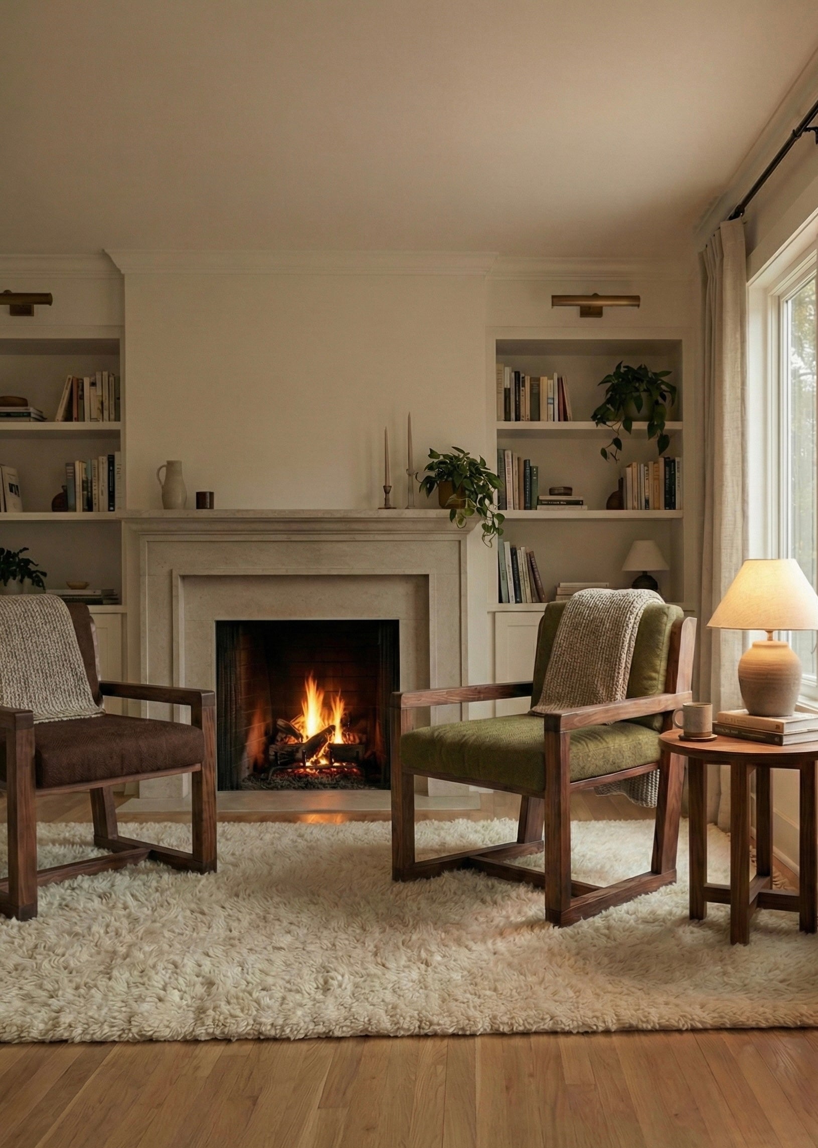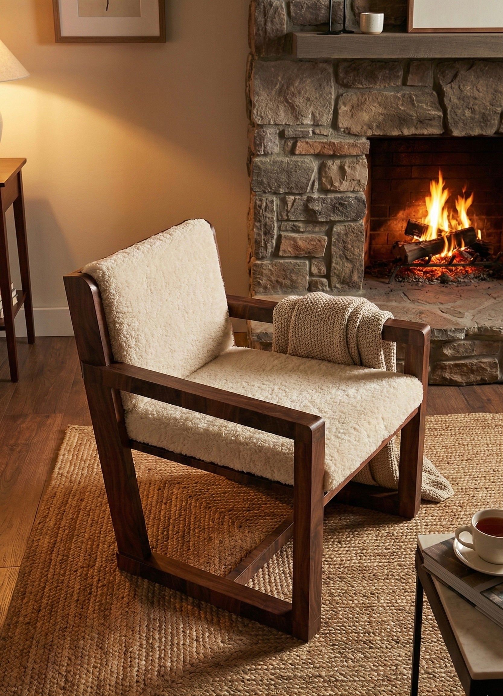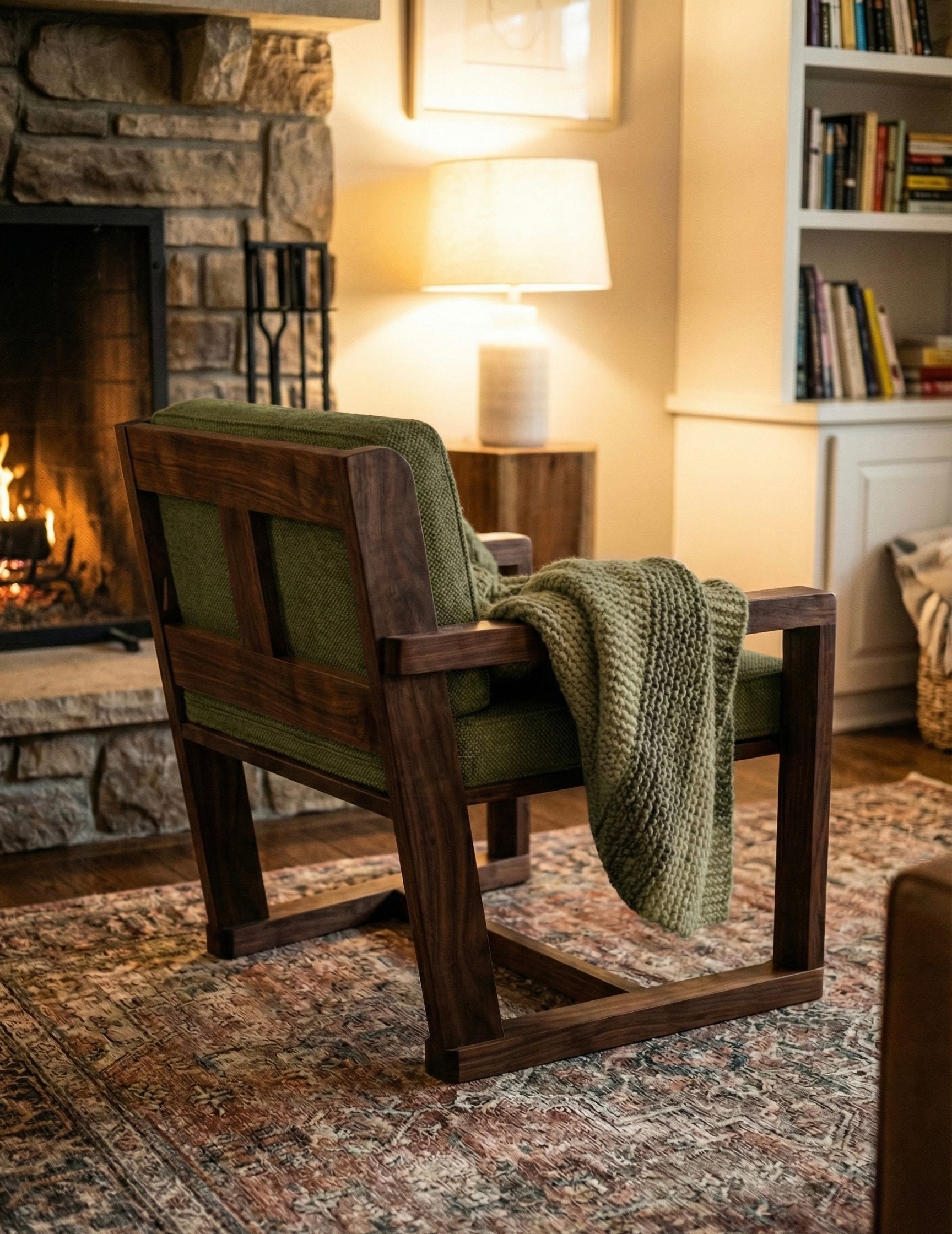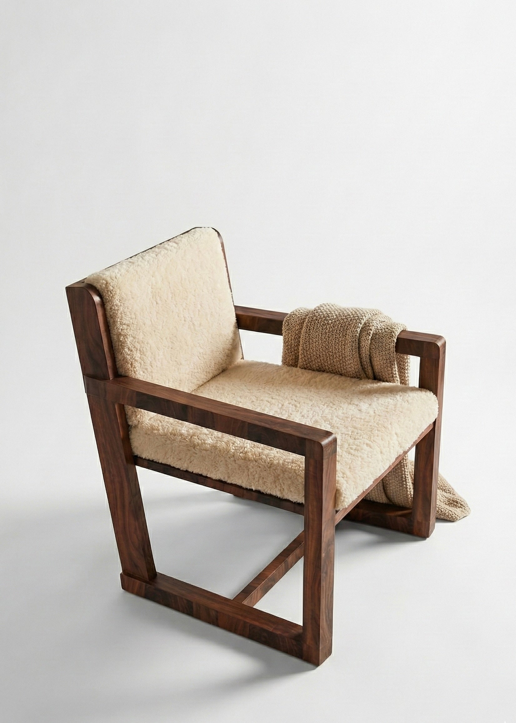 This modern lounge chair pairs a bold, geometric red oak frame with plush, oversized cushions for a perfect blend of comfort and minimalism. Its minimalist unique profile and clean, architectural lines create a striking silhouette that fits seamlessly into contemporary living rooms or offices.
